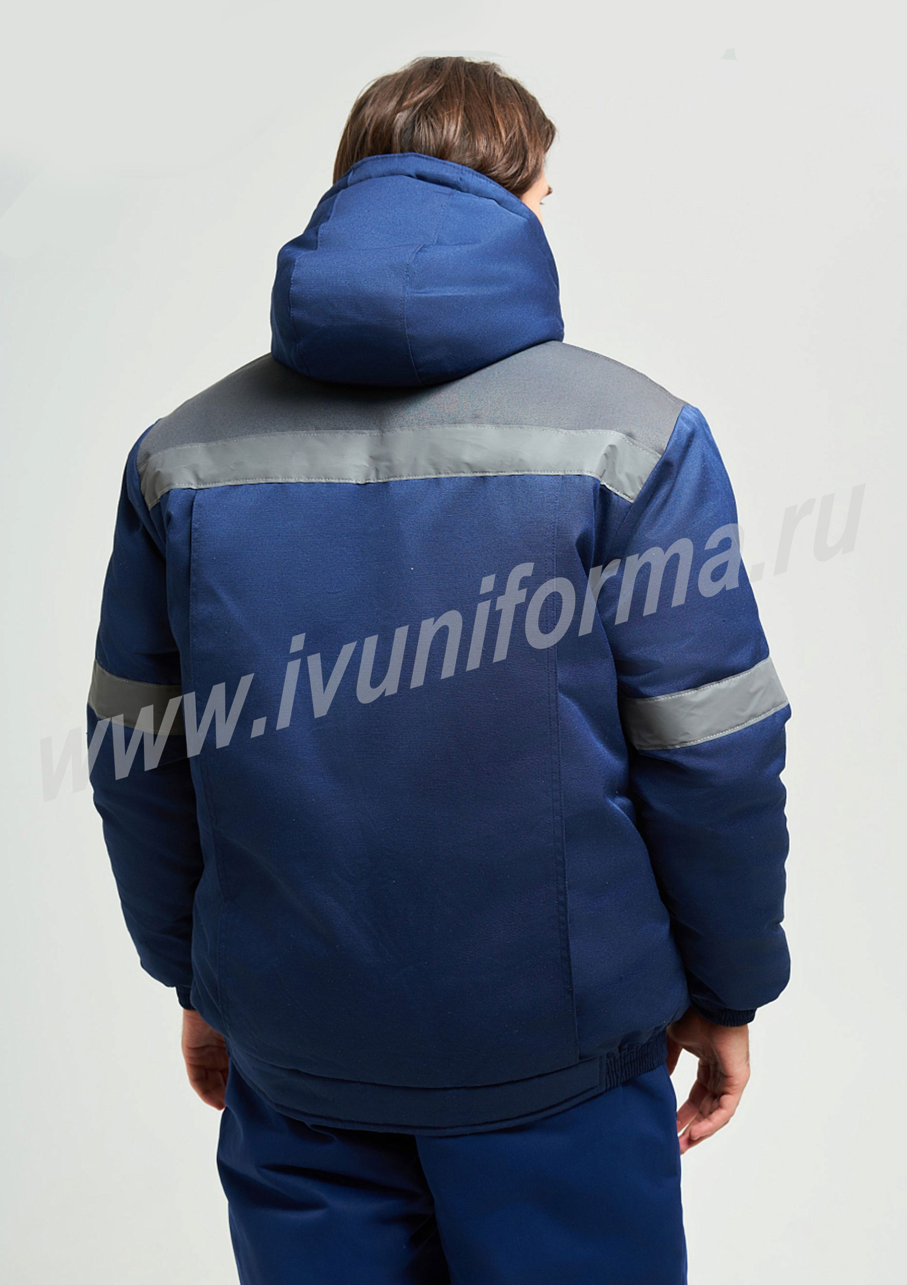 Куртка рабочая укороченная на поясе с центральной боровой застежкой на тесьму молнию, закрытую планкой на текстильной ленте велькро. Полочка состоит из двух частей, по линии стачивания которых настрочена светоотражающая лента шириной 50мм. На куртке два нагрудных накладных кармана с фигурным клапаном на текстильной ленте велькро. Два накладных боковых кармана с фигурным клапаном с соответствующей застежкой. Боковой карман имеет дополнительный карман. Наличие кармана внутри. Спинка состоит из двух частей, по линии стачивания которых настрочена светоотражающая лента шириной 50мм. На основной части спинки две складки. Рукав втачной одношовный. Низ рукава оформлен резинкой, внутри трикотажный манжет. Капюшон утепленный объемный с хомутом, пристегивается на молнию.